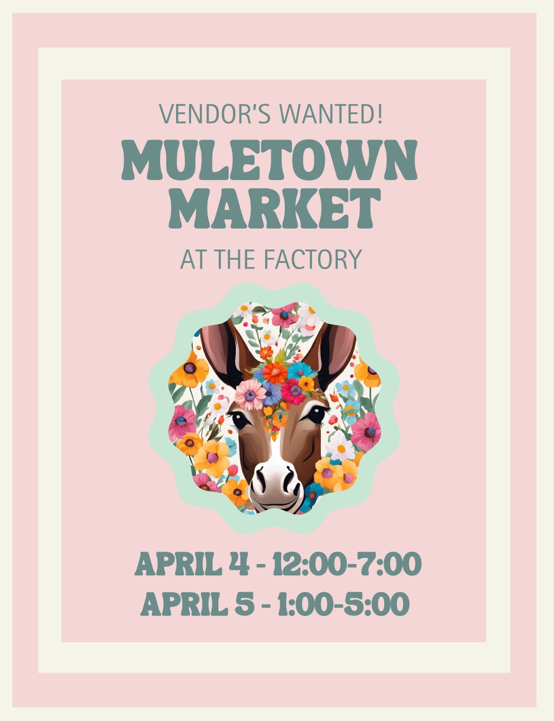 Attention all makers, sellers, and creators! This year, The Factory at Columbia is celebrating Mule Day like never before, and we want you to join in the fun! On April 4th & 5th, come showcase your one-of-a-kind products, handmade crafts, and delicious treats. Be a part of the Muletown Market and continue our community’s cherished Mule Day tradition. Space is limited—don’t miss this chance to be a part of something truly special! Apply at the link below: